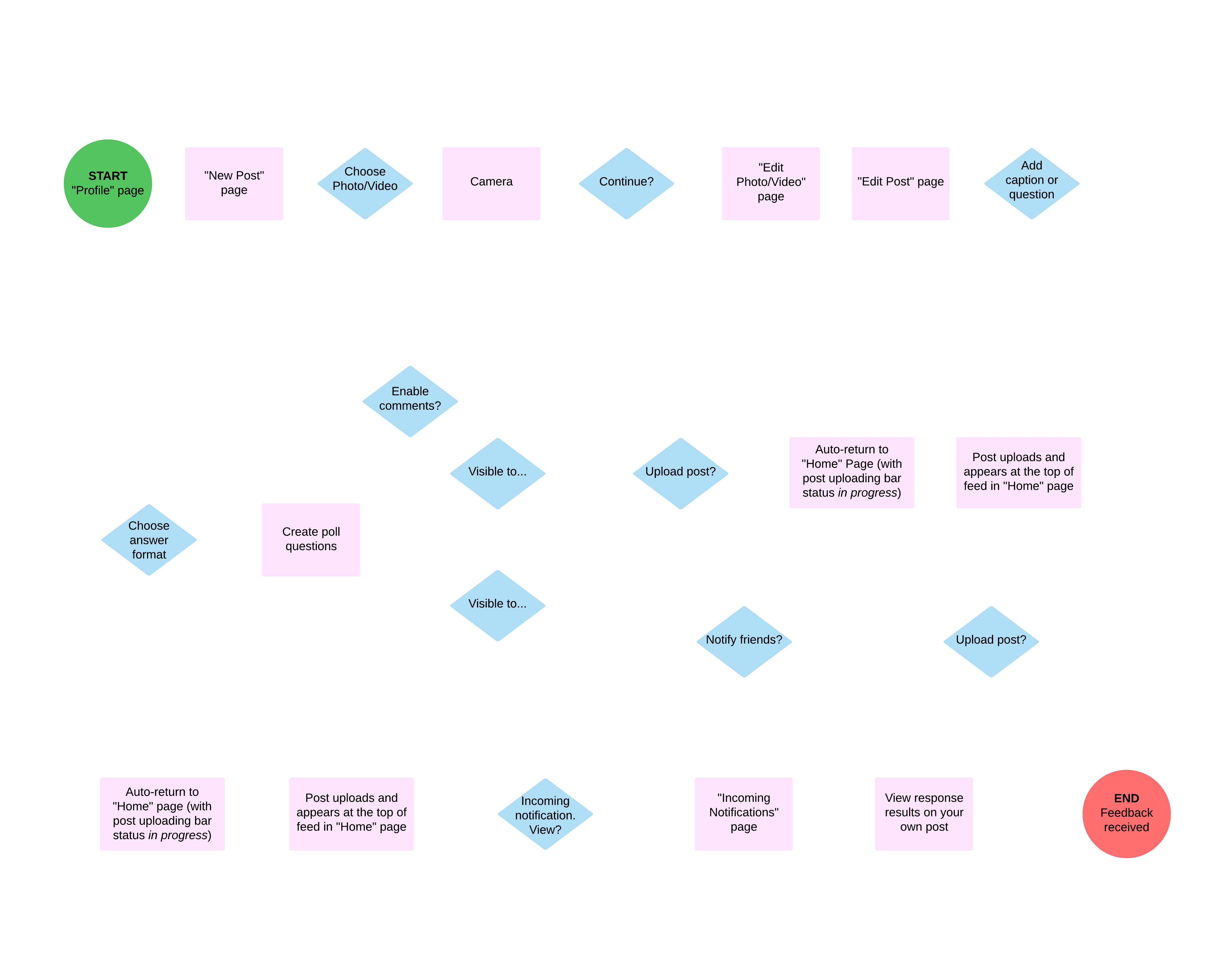 We mapped the core task from the user’s perspective, starting with creating a post, selecting and editing outfit photos, adding a poll, choosing visibility, uploading the post and finally receiving votes and feedback on their outfit.