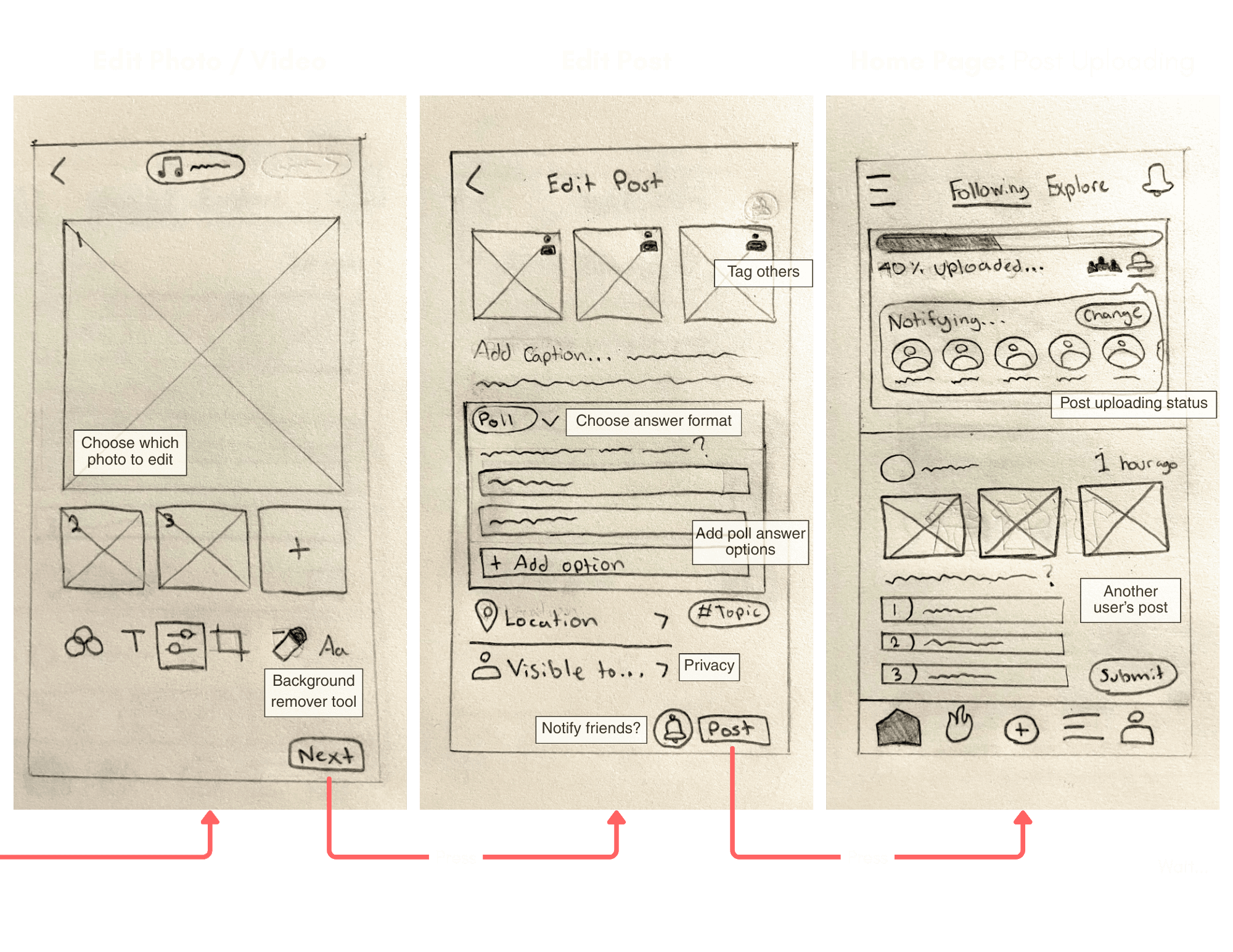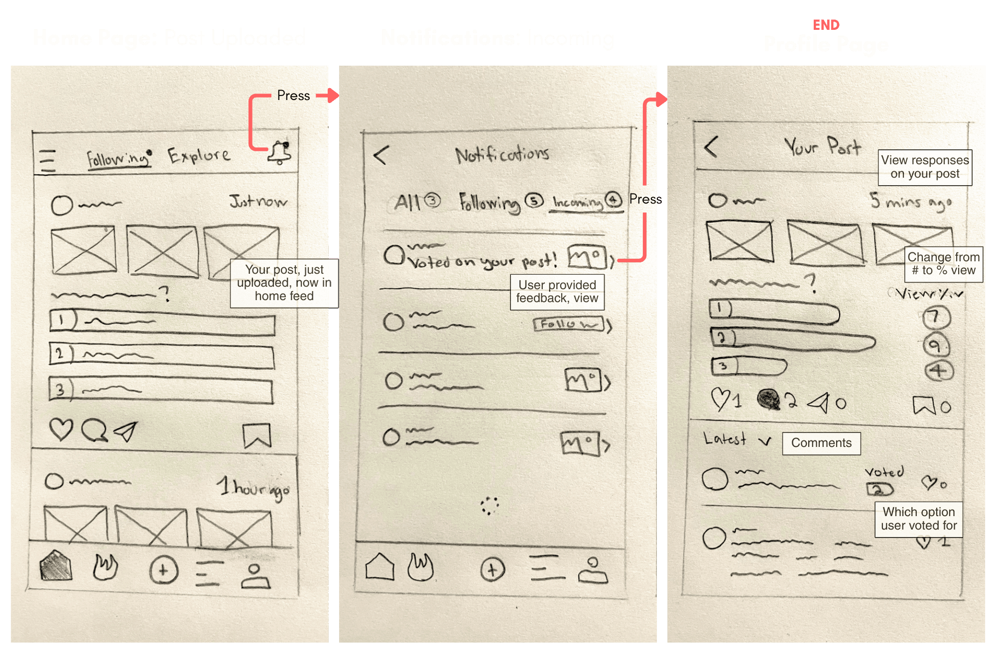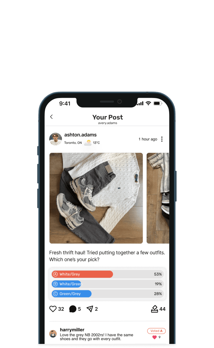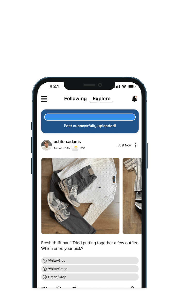 We collaboratively sketched wireframes to explore this flow, focusing on clear photo selection, simple poll creation and an interface that makes posting and receiving feedback fast and intuitive.