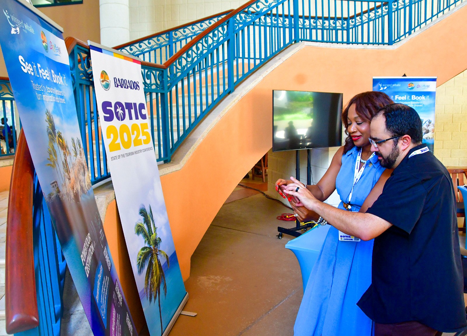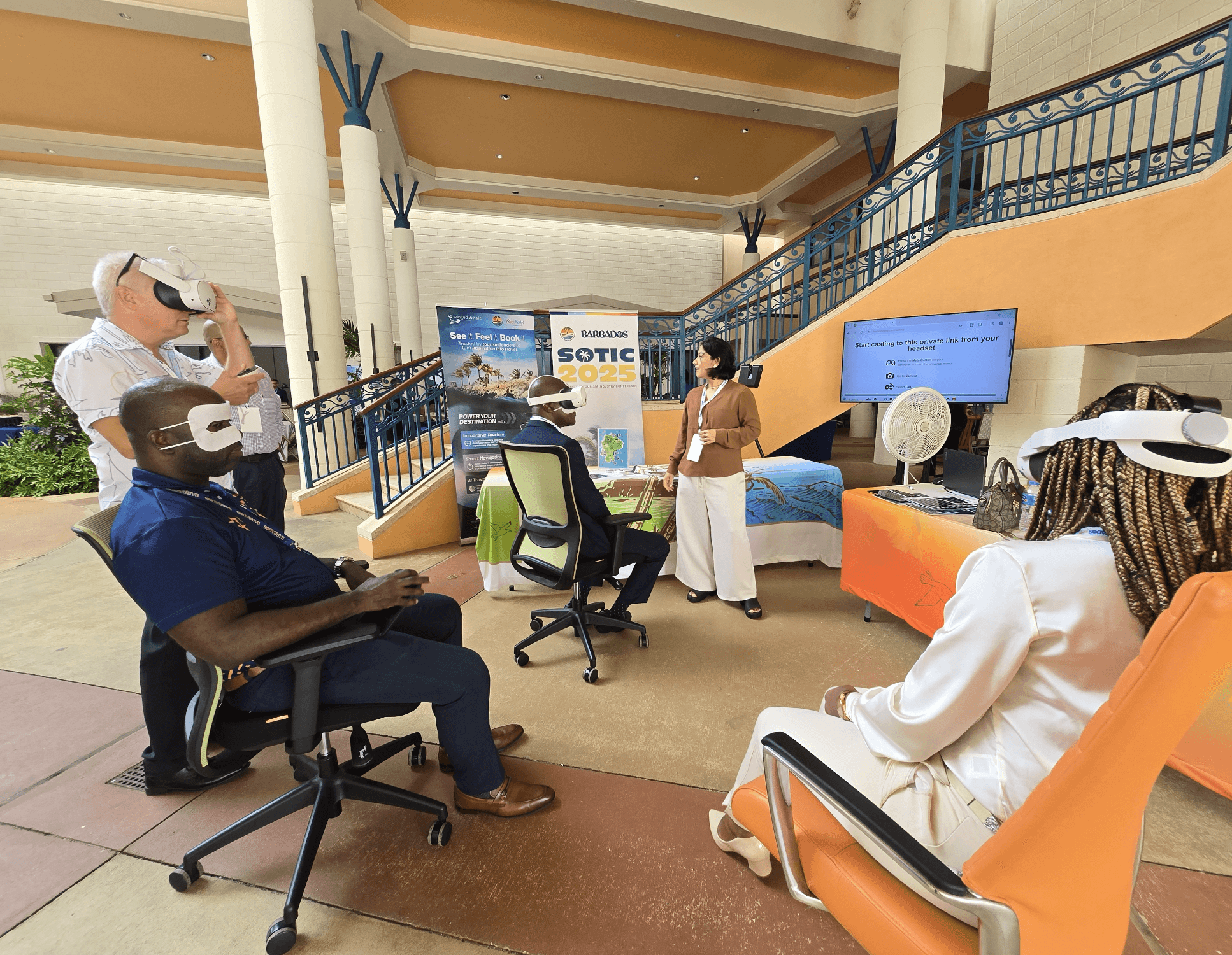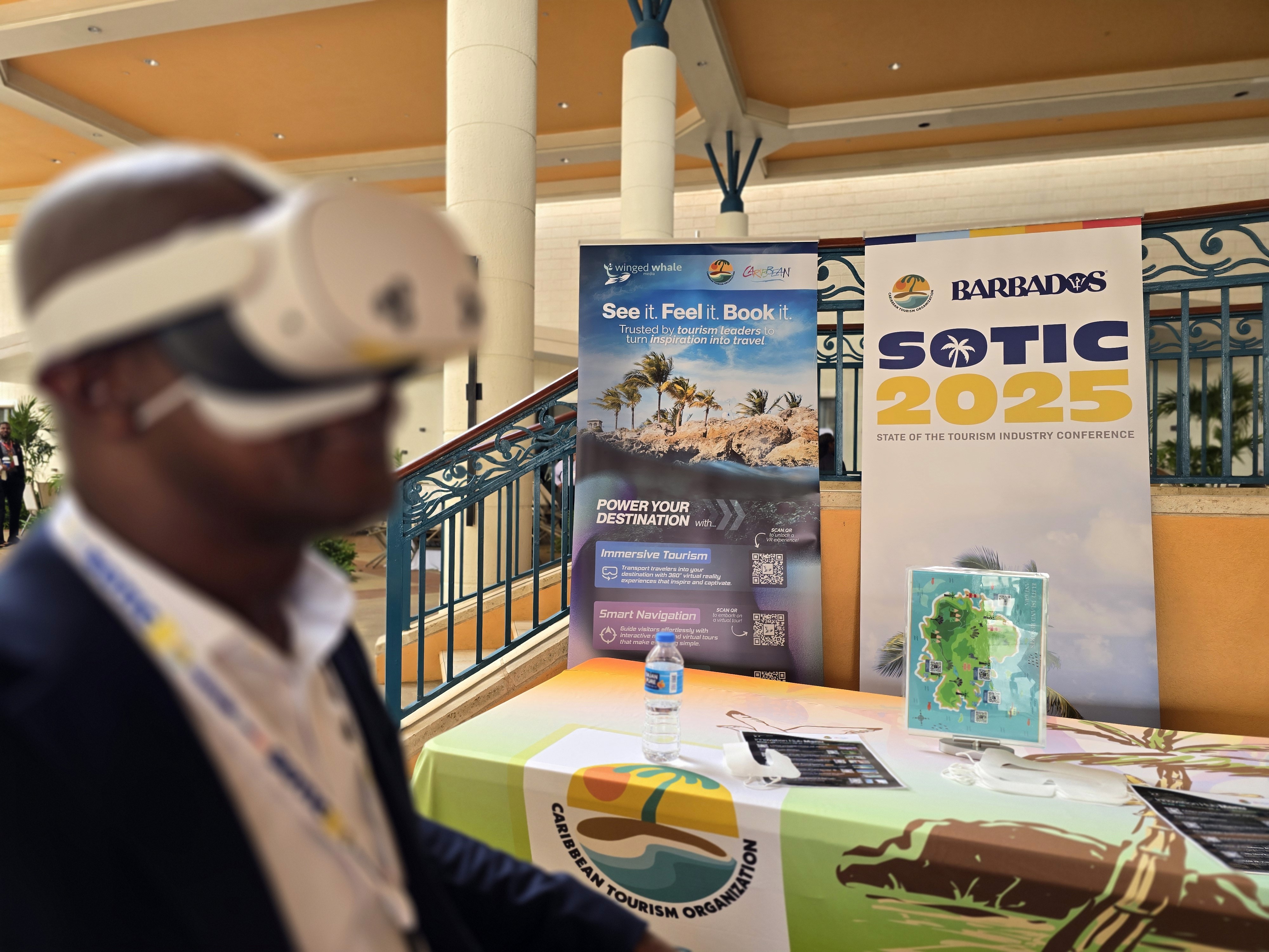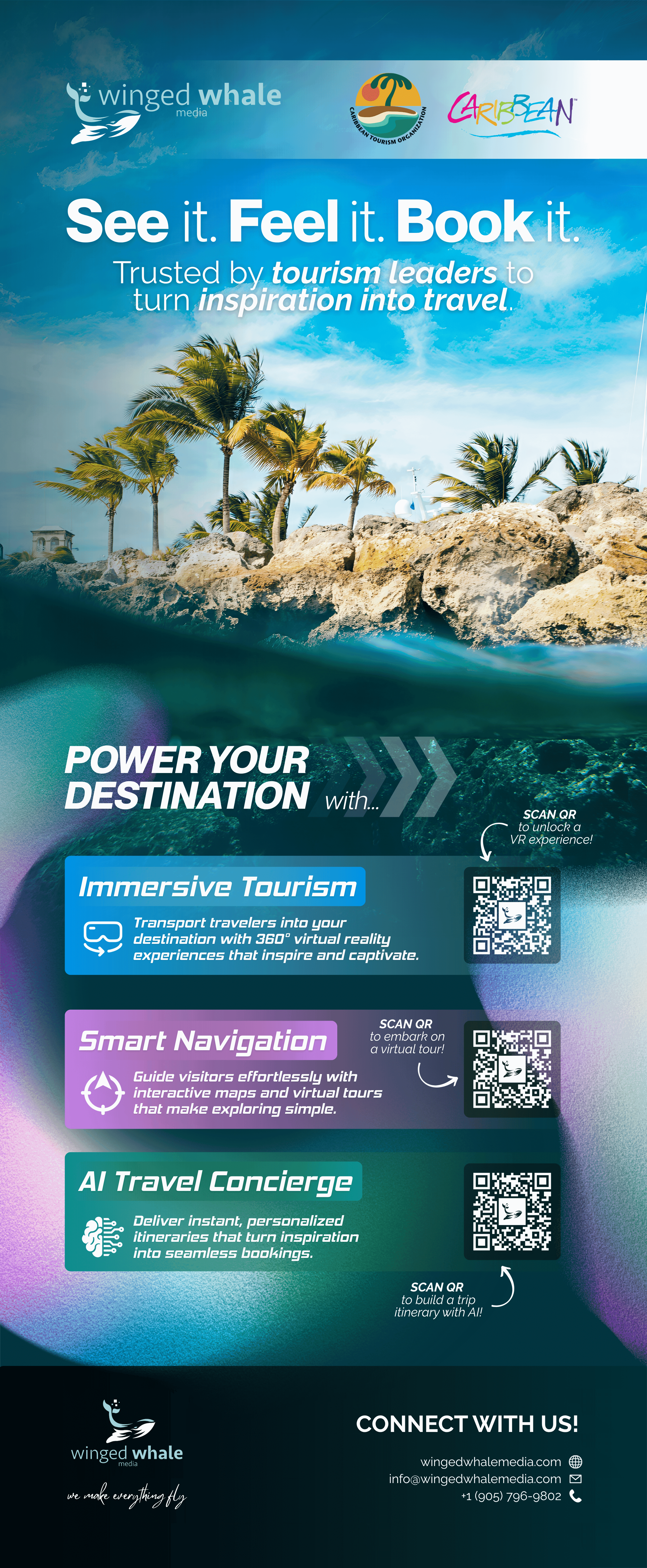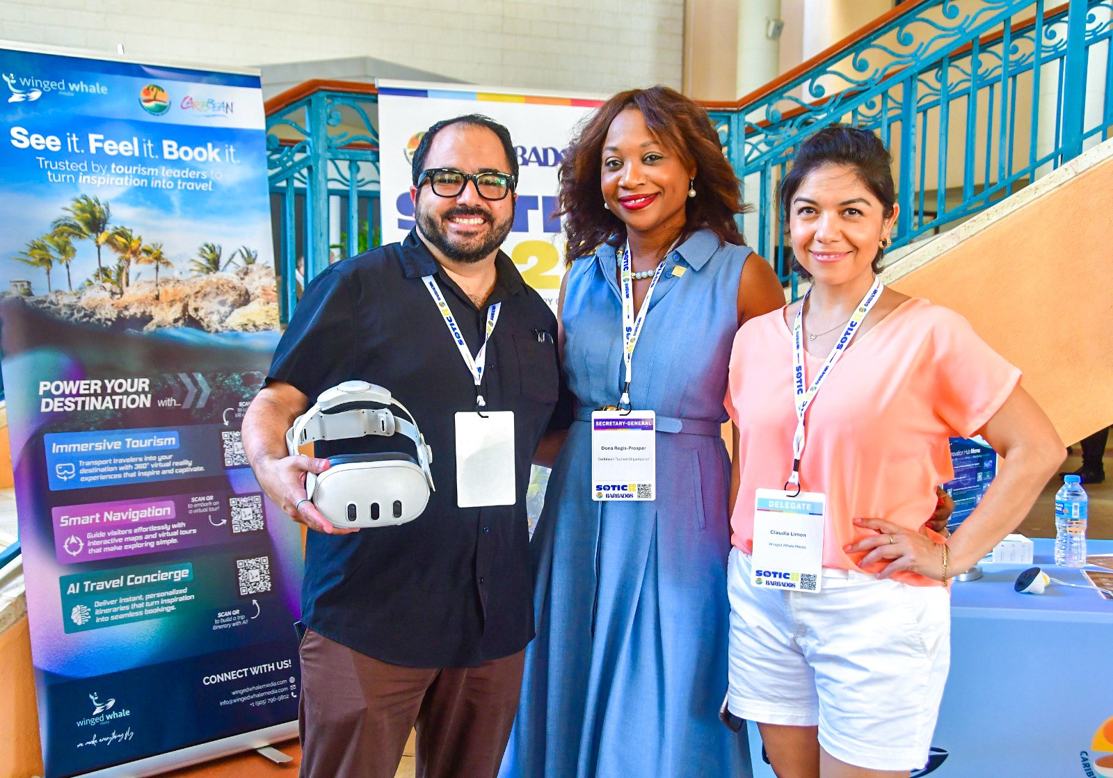 A cleaner, clearer banner with stronger hierarchy, improved color choices, and bolder typography. It positions WWM as an innovation-focused XR studio. The design communicates a clear message, integrates interactive QR entry points, and is easier for attendees at busy events to understand at a glance. Branded in partnership with the Caribbean Tourism Organization (CTO) for the Innovation Hub at the State of the Tourism Industry Conference (SOTIC) 2025.