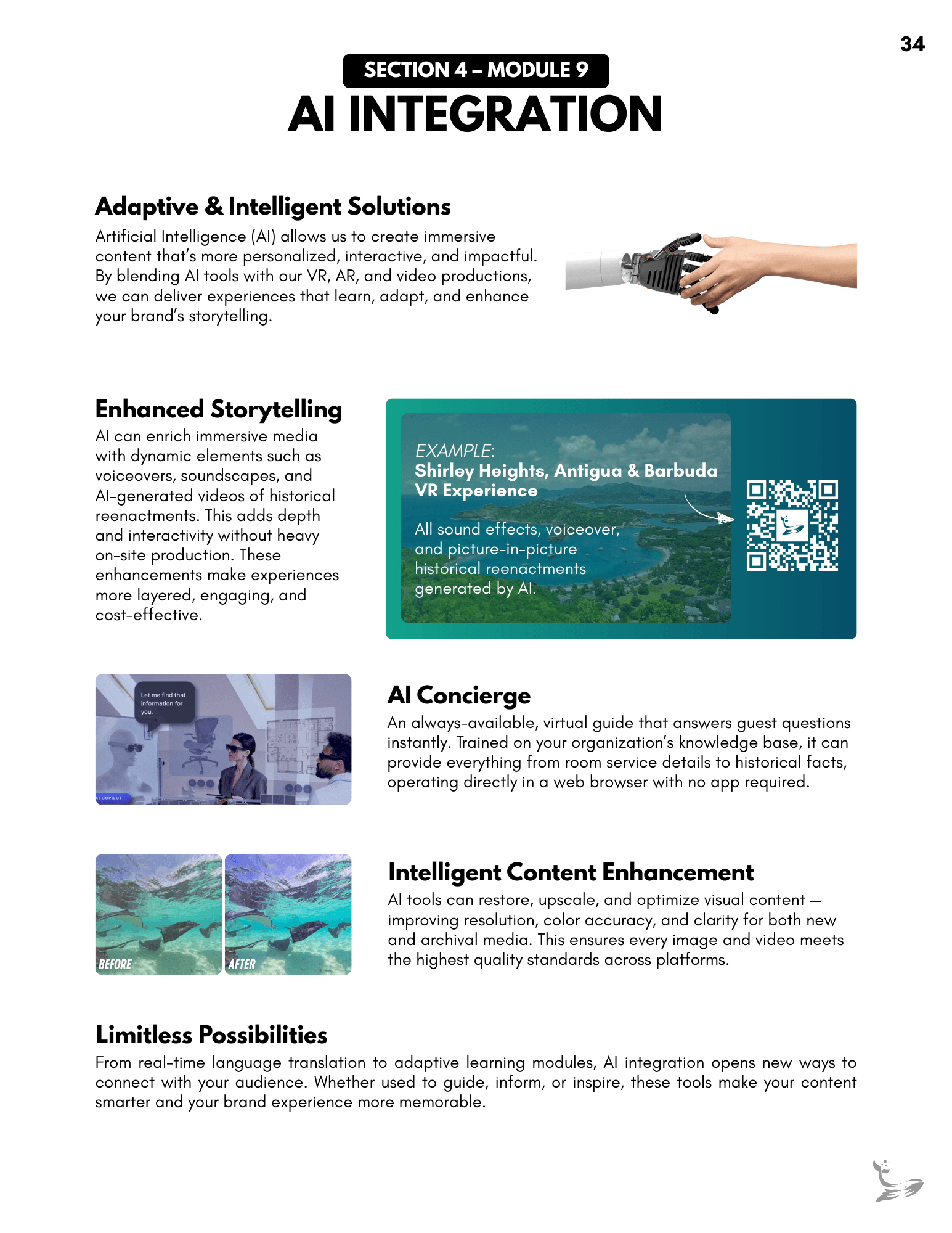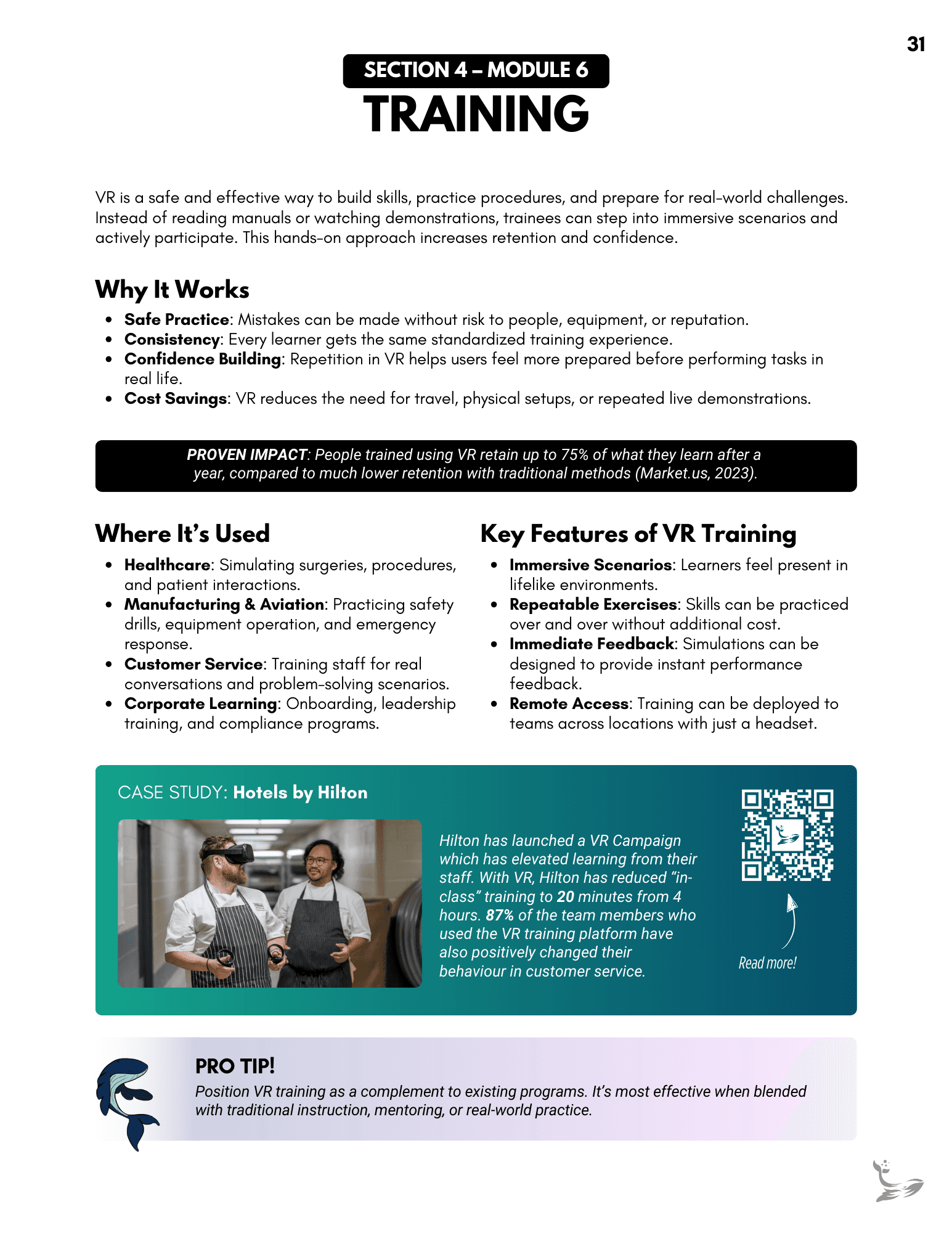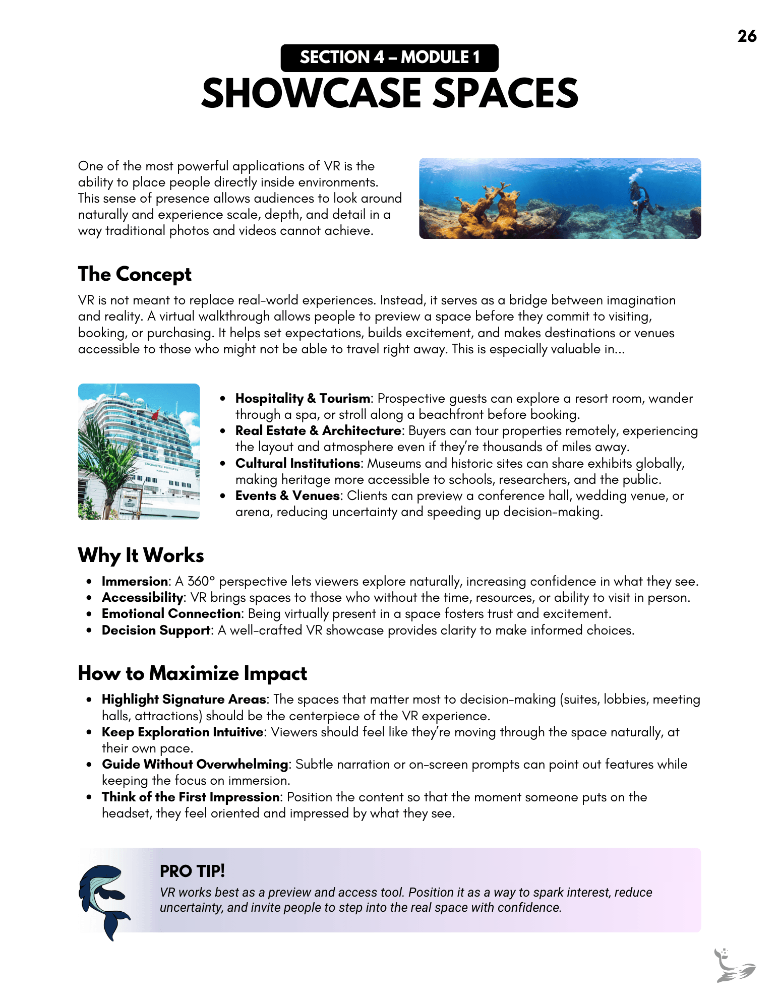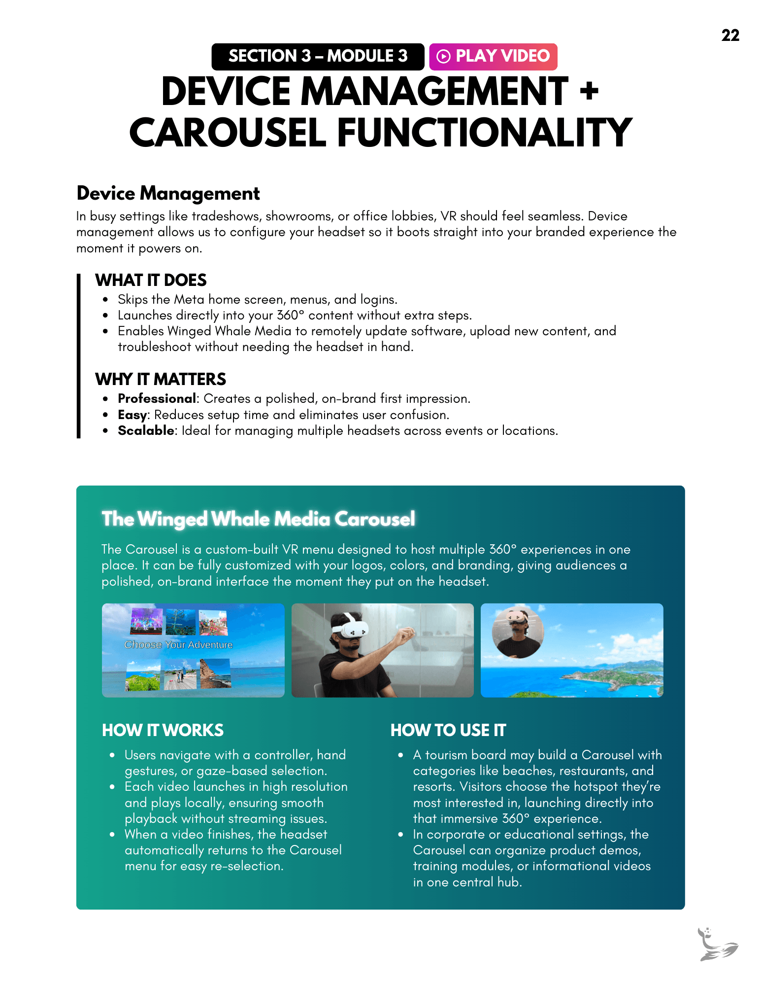 A full client-facing onboarding guide created to support headset setup, VR navigation, and best-practice strategies for using immersive content. It organizes everything into clear modules, giving clients an always-available reference they can revisit as they introduce VR to their teams. Links throughout the document connect directly to relevant moments in the instructional video, creating a cohesive learning experience.