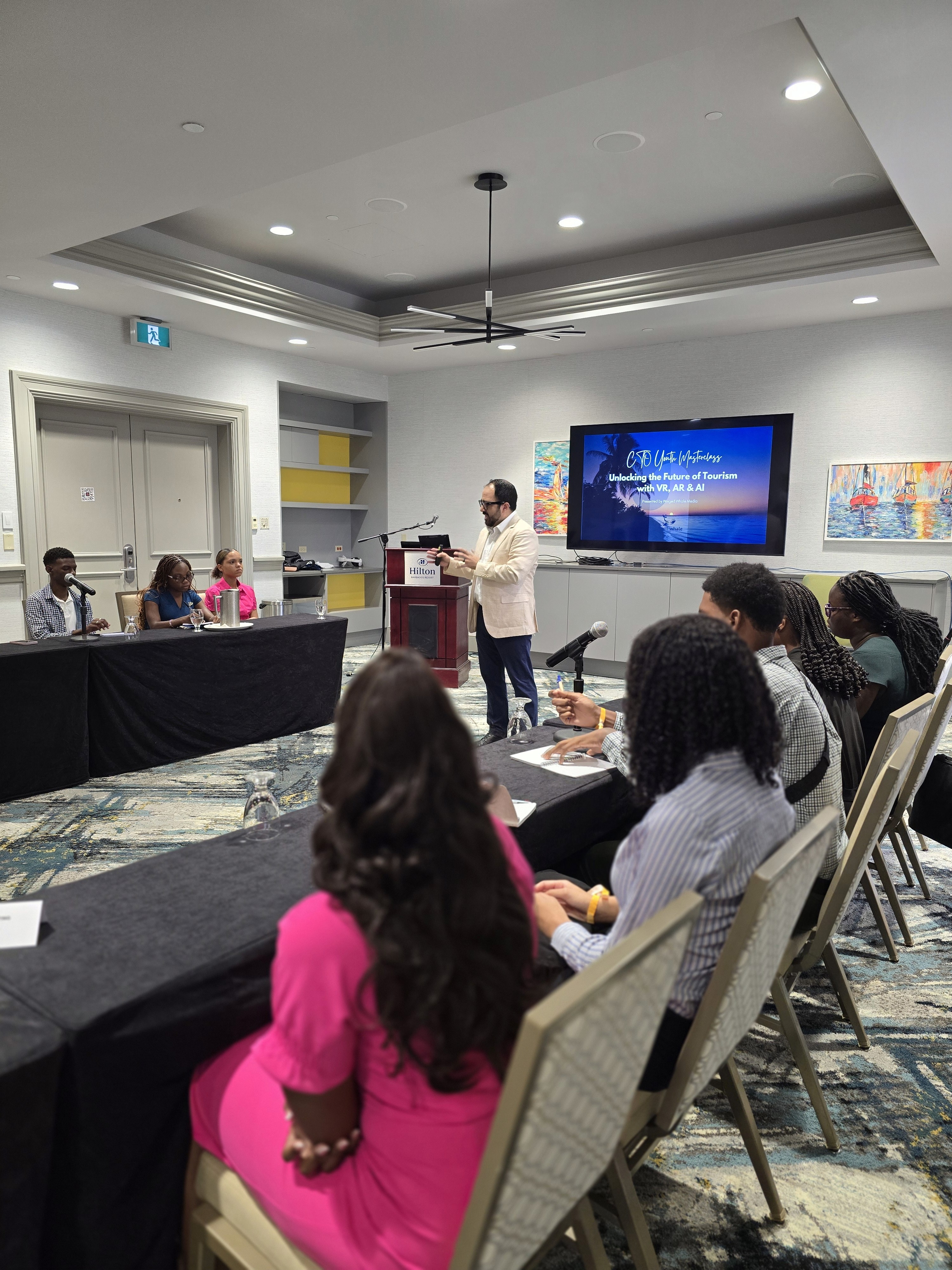 Winged Whale Media has used the onboarding guide and instructional video in multiple VR masterclasses around the world. These sessions help decision-makers, tourism leaders, and young innovators learn how to set up headsets, navigate VR experiences, and confidently use their delivered assets. Below are images from the most recent session at the Youth Congress during the State of the Tourism Industry Conference (SOTIC) 2025 in Barbados.